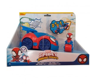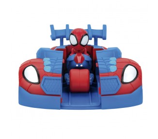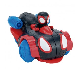 Spiderman. Edad: +3 años. Aprieta en el alerón y saldrá impulsado Spidey en su super motocicleta del interior del coche.