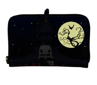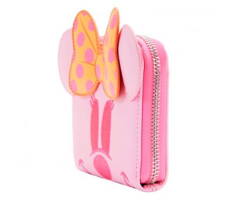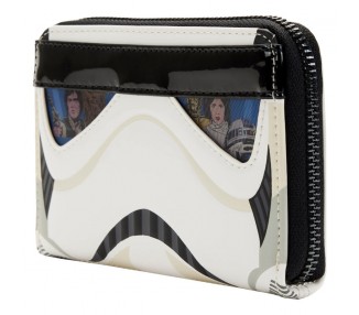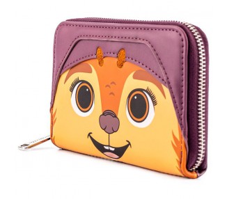 Tamaño: 12,5x10cm. Está hecha de piel vegana (poliuretano). El monedero se cierra con cremallera y herrajes de metal plateado brillante. Otras características incluyen apliques, láminas plateadas y detalles impresos. Destaca el forro interior a juego.