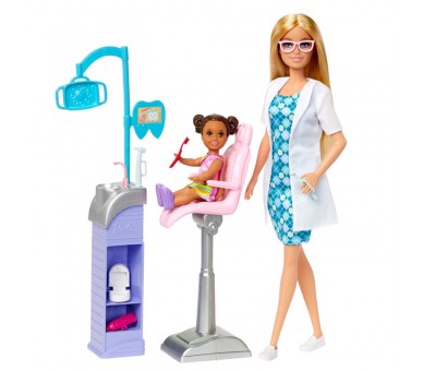 Edad: +3-4 años. Incluye una muñeca Barbie con un vestido, unos zapatos y dos accesorios. La muñeca no puede tenerse en pie por sí sola. Los colores y la decoración pueden variar. Pásate por la clínica para hacerte una revisión y prepárate para hacer brillar todas las sonrisas con la muñeca Barbie Dentista. Este conjunto de juego incluye dos muñecas, un puesto de dentista con lavabo, un sillón para la paciente y accesorios más pequeños, desde utensilios dentales hasta un cepillo y pasta de dientes. Guarda los accesorios en los estantes del puesto de dentista. Las piezas encajan perfectamente en las manos de la muñeca para que la experiencia de juego de imitación sea más realista. La muñeca Barbie Dentista, equipada con su bata blanca, está lista para ocuparse de su adorable paciente. ¡Niños y niñas pueden adoptar los papeles de doctora y paciente para divertirse contando historias! ADVERTENCIA: No conviene para niños menores de 36 meses.