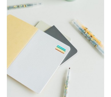 Contenido: bolígrafo, lápiz, 3 cuadernos A6, pack de 4 subrayadores, 2 clips con topper, 2 hojas de pegatinas, pack de notas sticky y portatodo.