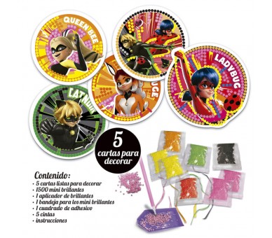 Contenido: 5 cartas listas para decorar, 1500 mini brillantes, 1 bandeja para los mini brillantes, 1 cuadrado de adhesivo, 5 cintas e instrucciones. Pega los mini brillanes en tus cartas de Miraculous Ladybag y sus amigos para darles vida y un fabuloso efecto centelleante.