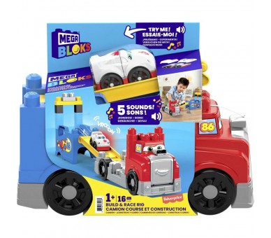 Edad: 1-5 años. MEGA Bloks Camión de carreras y construcción. Camión de competición construible con ruedas que giran de verdad. ¡Incluye un coche de carreras fácil de construir que emite cinco sonidos de competición! El camión se puede reconfigurar en forma de pista de carreras acrobática. Viene con ocho bloques de construcción y tres tramos de pista que se pueden montar de diferentes maneras. El práctico camión permite guardar en su interior todos los bloques de construcción y el coche de carreras.