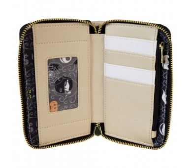 The Nightmare Before Christmas. Tamaño: 15x10cm. Piel vegana (poliuretano). Aproximadamente cuatro ranuras para tarjetas. Un compartimento transparente para el DNI. Cremallera para sujetar objetos. Herrajes de metal dorado brillante. Detalles en relieve, brillantes en la oscuridad y estampados. Forro interior a juego.