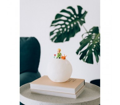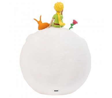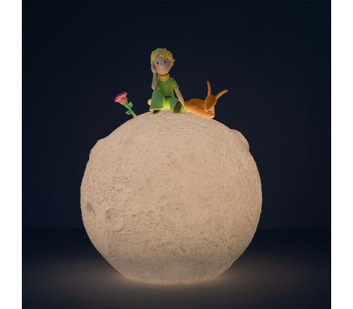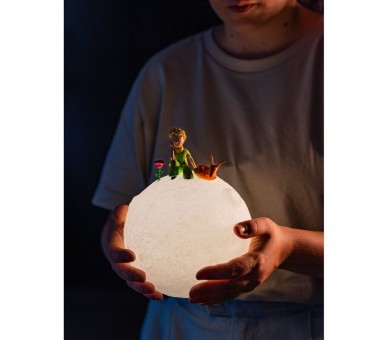 Lámpara 3D de El Principito, con la forma de la Luna. Modo de iluminación cálida. Incluye botón de control. Fabricada en PVC. Funciona con 3 pilas AAA (no incluidas) o USB tipo C (incluido).