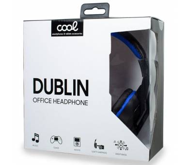Auriculares COOL Dublin con micrófono incorporado de alta calidad, con varilla ajustable. Ideal para escuchar música, usar en videojuegos o ver películas. Color negro con detalles en color azul. Auricular y soporte superior acolchados para una mayor comodidad.