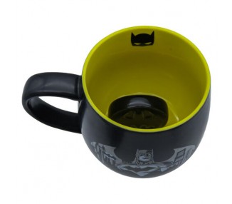Tamaño: 12,5x8,3x9,5cm. Esta taza de cerámica tiene una sorpresa caprichosa, cuando llegas al fondo de tu bebida te encontrarás con el escudo de Batman en 3D.