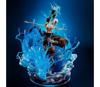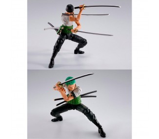 Tamaño: 15cm. Figura articulada. Contiene: 3 pares de manos, 2 expresiones faciales para la cabeza estándar, 2 expresiones faciales para la cabeza con el pañuelo (tenugui), 1 par de katanas para llevar en cinturón y 3 katanas desenvainadas. Además, contiene 1 expresión facial para la figura de Monkey D. Luffy.