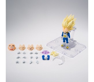 Tamaño: 14cm. Figura articulada. Contiene: 2 cabezas opcionales, 2 manos izquierdas, 4 manos derechas, 1 par de brazos cruzados, 1 pie opcional, aura angelical, cola y 1 bola de Dragón de Namek (5 estrellas).
