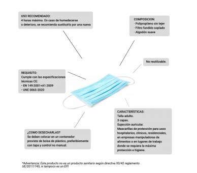 De 3 capas, hipoalergénicas y desechables. Están especialmente diseñadas para filtrar el aire exhalado y proteger a los que están alrededor.