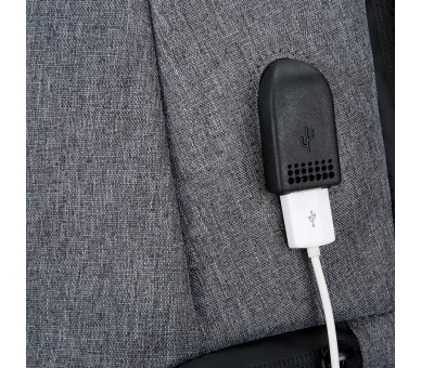Incorpora bolsillo con cremallera central, bolsillo externo y compartimento interior, y puerto USB con cable comunicado a un bolsillo pequeño interior con cable USB en el interior de la mochila.