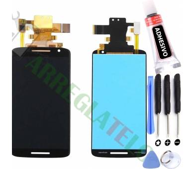 Este kit incluye todo lo necesario para realizar la reparación de la pantalla de tu Motorola Moto X Play: una pantalla LCD de repuesto de alta calidad, una herramienta para desmontar el teléfono, un adhesivo especial para fijar la pantalla correctamente y un conjunto de instrucciones detalladas paso a paso para guiarte en todo el proceso.