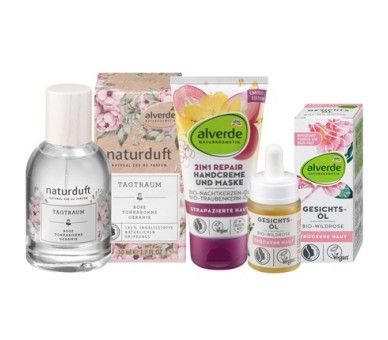 • Alverde NATURKOSMETIK Skin Care Set: Daydream Eau de Parfum with 100% Natural Fragrance Essences 50ml + 2in1 REPAIR Hand Cream 75ml + WILDROSE Face Oil 15ml