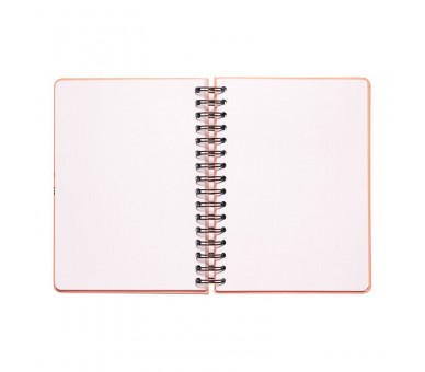 Tiene 90 hojas de tamaño A5. Cubiertas en tapa dura con encuadernación wire-o. Cierre con banda elástica. Incluye bolsillo interior. Esquinas exteriores redondeadas.
