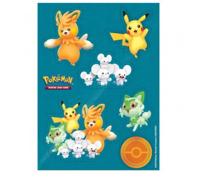 Edad: +6 años. Contiene: 7 cartas holográficas de promoción de Pikachu, Sprigatito ex, Pawmi, Pawmo, Pawmot ex, Tandemaus y Maushold ex. 1 hoja con pegatinas especiales. 1 miniálbum. 1 muñeco blandito de Pikachu. 6 paquetes de mejora de JCC Pokémon. 1 carta con código para JCC Pokémon Live.