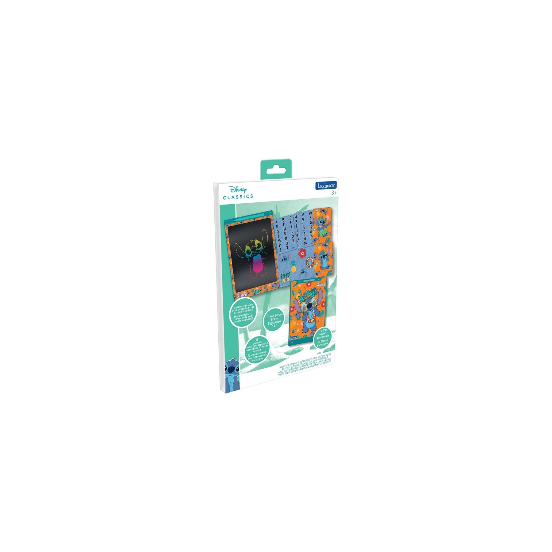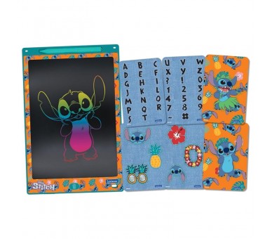 6 plantillas inspiradas en Stitch para dibujar letras y héroes en una generosa pantalla de 28cm. Los borrones accidentales son historia gracias a nuestra lengüeta de bloqueo. El lápiz óptico incluido, con una práctica zona de almacenamiento,