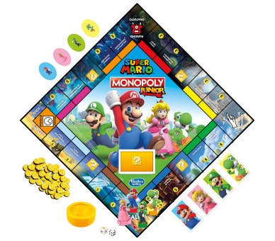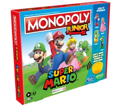 Versión en español. El juego Monopoly Junior se une con los personajes y temas de Super Mario para hacer un emocionante juego infantil. En el juego de mesa Monopoly Junior: Super Mario, los jugadores pueden imaginar que recorren el Reino Champiñón como Mario, Peach, Yoshi o Luigi, comprando propiedades y recolectando monedas. Los jugadores tiran el dado de poder para saber si pueden presionar la Moneda Sonora, que reproduce el sonido de moneda de Super Mario, y recolectar monedas. Este divertido juego es ideal como regalo de cumpleaños o de Navidad para fans de Super Mario y niños partir de 5 años. Marca registrada y propiedad intelectual de Nintendo 2021. Todos los derechos reservados. Los nombres y logotipos de Hasbro, Hasbro Gaming, Parker Brothers y Monopoly, el diseño distintivo del tablero, las cuatro casillas de las esquinas, el nombre y el personaje de Mr. Monopoly, así como cada uno de los elementos distintivos del tablero y piezas de juego, son marcas registradas de Hasbro, Inc. para su juego de las operaciones inmobiliarias y equipo del juego.