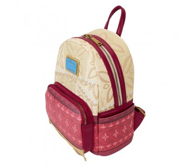 Tamaño: 26,8x26,6x11,4cm. Piel vegana (poliuretano), Tirantes acolchados y ajustables. Compartimento principal con cremallera. Bolsillo frontal con cremallera. Asa superior resistente.Paneles laterales con ilustraciones. Herrajes metálicos dorados. Detalles en relieve y estampados. Forro interior a juego.