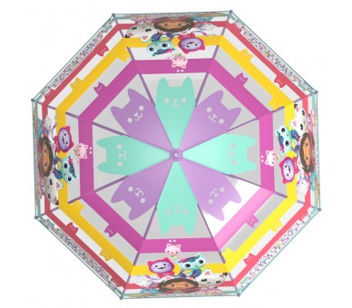 Gabby Doll House. Este cómodo paraguas manual de varillas de fibra de vidrio de 48 cm y asa de gancho es el complemento perfecto para los días de lluvia. Apertura manual con sistema de seguridad que incluye protecciones de plástico pegadas y cosidas a la varillas para garantizar la seguridad de lo más pequeños de la casa. Superficie de cobertura de 71 cm, perfecta para evitar que se mojen aunque lleven mochilas. Su diseño transparente permite que los niños vean caer la lluvia junto a sus personajes favoritos.