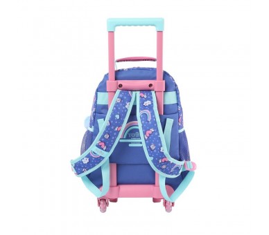 Tamaño: 29x41,5x17cm. Esta mochila en tamaño mediano con ruedas incluye un compartimiento principal con cierre en doble cremallera, correas acolchadas ajustables para los hombros, bolsillos laterales porta botellas y bolsillo frontal con cierre en cremallera. Además, cuenta con organizadores internos, e identificador de nombre y curso en la parte posterior.